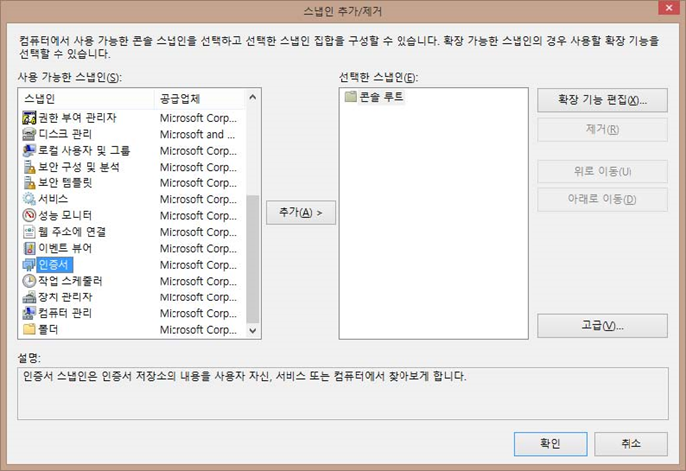 3. 스냅인 추가/제거 창에서 "인증서" 항목 선택 후 추가버튼 클릭